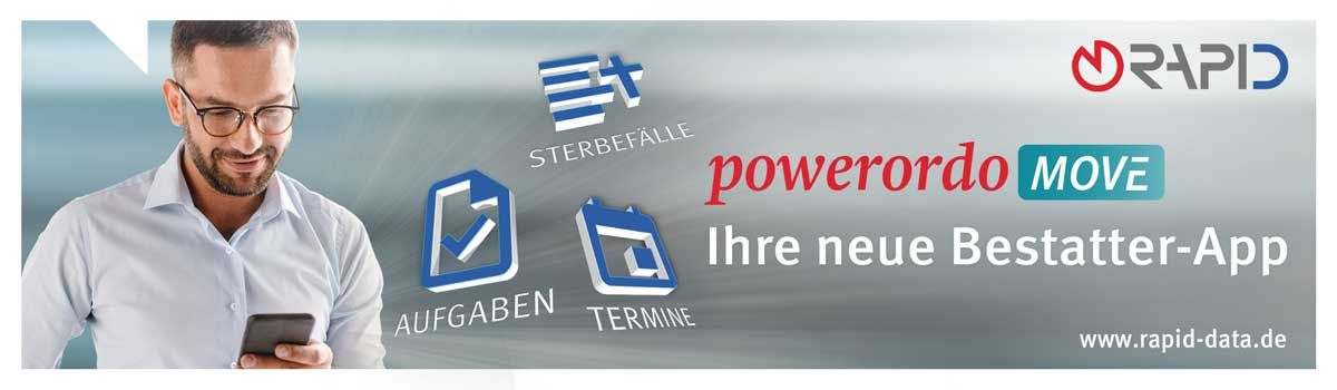 Ob morgens beim Frühstück oder mittags auf dem Friedhof – von nun an haben Sie mit der neuen Bestatter-App PowerOrdoMOVE von Rapid Data jederzeit und überall Termine, Aufgaben, Kontakte und Infos zu den Sterbefällen auf dem Smartphone parat. So sind Sie und Ihr Team auch außerhalb Ihres Büros bestens organisiert! Dieses neue mobile Arbeiten bedeutet für alle in Ihrem Bestattungshaus: mehr Transparenz und Überblick, bessere Zusammenarbeit, höhere Effizienz und vor allem das gute Gefühl, jederzeit und überall alles im Griff zu haben!