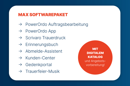 Die freien Kapazitäten ermöglichten es uns, zwei Häuser zu übernehmen und unser Unternehmen weiterzuentwickeln. Ein Kollege, der noch mit Excel arbeitet, fragte erstaunt, wie wir das schaffen können. Meine Antwort: Mit einer guten Bestattersoftware.