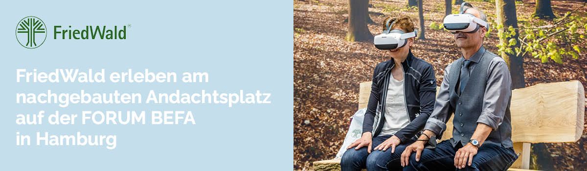 Am 28. und 29. März holt FriedWald auf der FORUM BEFA in Hamburg den Wald in die Messe-Halle. Erleben Sie inmitten unseres nachgebauten Andachtsplatzes – dem zentralen Ort des Erinnerns und Gedenkens im FriedWald – was die Bestattung in der Natur besonders macht, und kommen Sie mit FriedWald-Expertinnen und -Experten ins Gespräch.