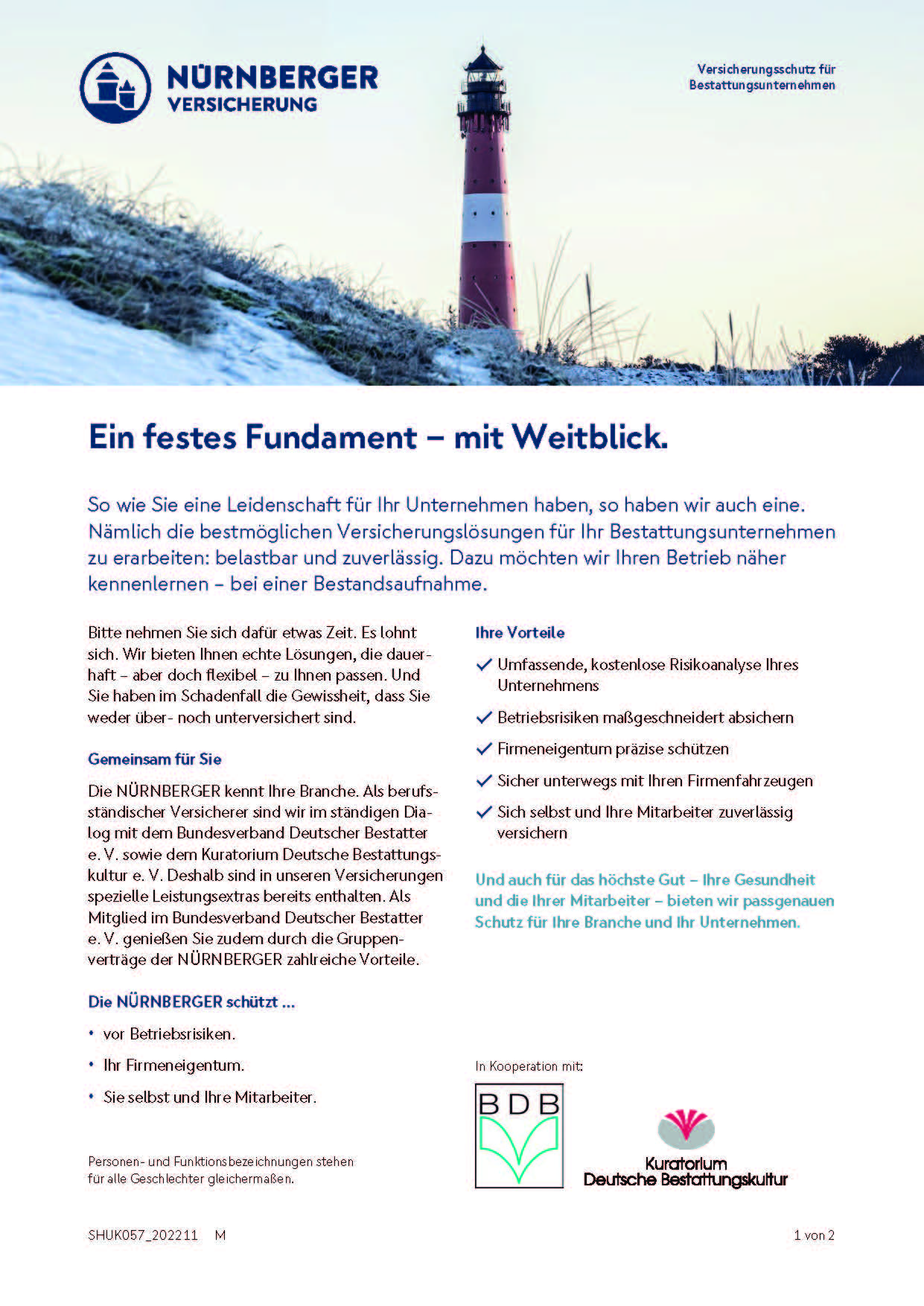 Dem Anliegen, den Menschen eine attraktive Sterbegeld- Absicherung zu bieten, bleibt die NÜRNBERGER bis heute treu. Doch damit nicht genug: Die langjährige Zusammenarbeit mit dem Bundesverband Deutscher Bestatter und dem Kuratorium Deutsche Bestattungskultur versetzt sie in die Lage, die Erfahrungen, Vorstellungen und Wünsche der Bestatterschaft in Deutschland und diejenigen der Vorsorgenden in einem am deutschen Versicherungsmarkt einmaligen Produkt zu vereinen.