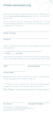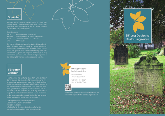 Seit 1997 setzt sich die Stiftung Deutsche Bestattungskultur für den Erhalt und die Förderung einer menschenwürdigen und dabei zeitgemäßen Bestattungskultur ein. Wir möchten die Auseinandersetzung mit Fragen rund um das Sterben und Trauern aus Randbereichen und Fachkreisen in die Öffentlichkeit tragen. Dazu fördern wir unterschiedlichste Partner aus Wissenschaft und Kultur, die sich im weiten Feld der Bestattungs-, Trauer- und Friedhofskultur engagieren. Informieren Sie sich auf unserer Website über unsere laufenden Förderprojekte und unser darüber hinausgehendes Engagement. Bei Fragen sind wir gerne für Sie da – wir freuen uns auf den Austausch mit Ihnen!